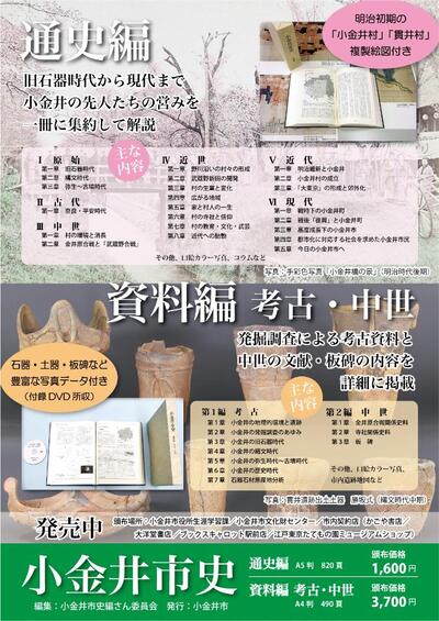平成20年度より取り組んで参りました小金井市史編さん事業が完成を迎え、市制施行60周年に際して、新たな小金井の歴史書「通史編」と資料編最終巻である「考古・中世」を刊行しました。
