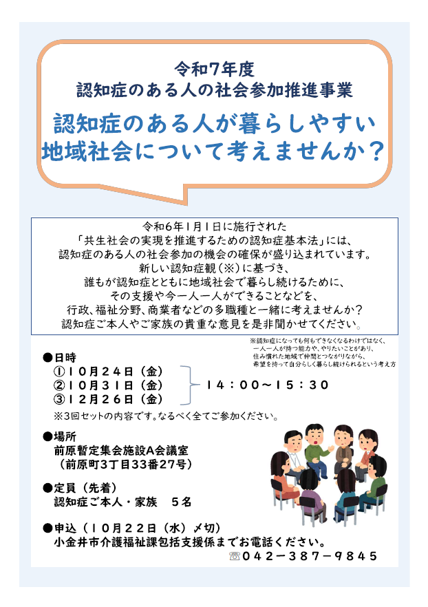 令和7年10月22日(水曜)までに小金井市介護福祉課包括支援係(電話:042‐387-9845)にお電話ください。