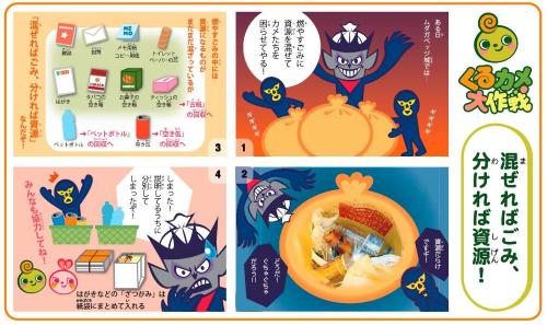 「くるくるカメくん」をはじめとしたオリジナルキャラクターたちが、ごみ減量とリサイクルの推進に向けて活躍する「くるカメ大作戦」を展開しています。
