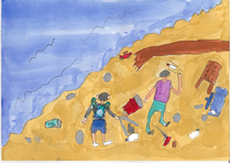 私が環境について考えたとき、まず海と鯨のことが思い浮かびました。 海洋汚染で鯨の尾の方が汚れています。そんな環境の中でも自由に泳ぐ鯨の姿を描きました。