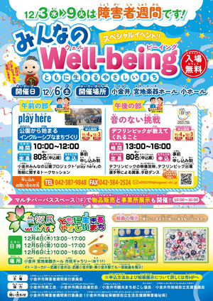 障害者週間(12月3日から12月9日)は、国民の障がい者の福祉についての関心と理解を一層深めるとともに、障がいのある方が社会、経済、文化その他あらゆる分野の活動に積極的に参加する意欲を高めるために定められました。小金井市では毎年、障害者週間スペシャルイベントを行っております。